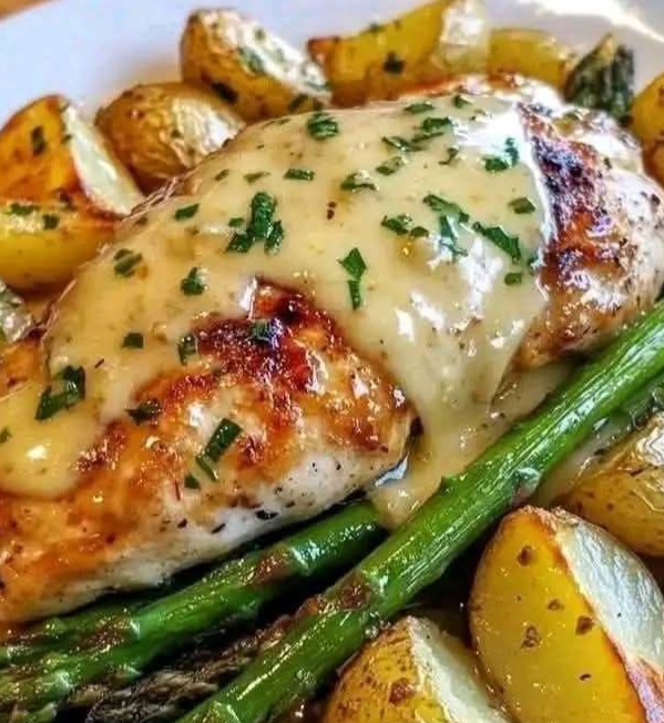 This meal brings together juicy chicken coated in a glossy honey-mustard glaze, tender roasted potatoes, and vibrant asparagus topped with melted cheese. Every bite offers contrast—crispy edges, creamy cheese, and the rich sweetness of honey balanced by the bold tang of Dijon. It’s hearty but still light, making it perfect for any season.
