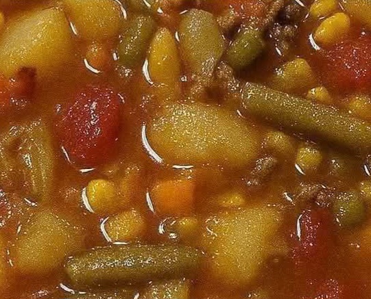 4. Add potatoes, carrots, celery, tomatoes, tomato sauce, corn, beans, and beef broth.