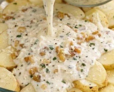 8. Remove potatoes from the oven and pour the creamy garlic Parmesan sauce over them.