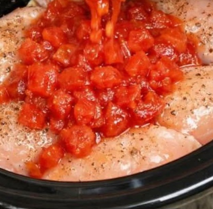 1. Place the chicken, diced tomatoes, paprika, and chicken broth into the slow cooker.